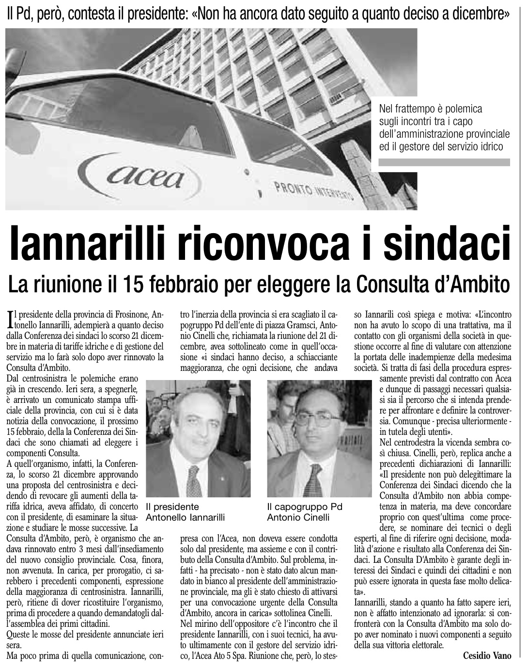 Ieri sera, a spegnerle, è arrivato un comunicato stampa ufficiale della provincia, con cui si è data notizia della convocazione, il prossimo 15 febbraio, della la Conferenza dei Sindaci che sono chiamati ad eleggere i componenti Consulta. A quell’organismo, infatti, la Conferenza, lo scorso 21 dicembre approvando una proposta del centrosinistra e decidendo di revocare gli aumenti della tariffa idrica, aveva affidato, di concerto con il presidente, di esaminare la situazione e studiare le mosse successive. La Consulta d’Ambito, però, è organismo che andava rinnovato entro 3 mesi dall’insediamento del nuovo consiglio provinciale. Cosa, finora, non avvenuta. In carica, per prorogatio, ci sarebbero i precedenti componenti, espressione della maggioranza di centrosinistra. Iannarilli, però, ritiene di dover ricostituire l’organismo, prima di procedere a quando demandatogli dall’assemblea dei primi cittadini. Queste le mosse del presidente annunciate ieri sera. Ma poco prima di quella comunicazione, contro l’inerzia della provincia si era scagliato il capogruppo Pd dell’ente di piazza Gramsci, Antonio Cinelli che, richiamata la riunione del 21 dicembre, avea sottolineato come in quell’occasione «i sindaci hanno deciso, a schiacciante maggioranza, che ogni decisione, che andava presa con l’Acea, non doveva essere condotta solo dal presidente, ma assieme e con il contributo della Consulta d’Ambito. Sul problema, infatti – ha precisato – non è stato dato alcun mandato in bianco al presidente dell’amministrazione provinciale, ma gli è stato chiesto di attivarsi per una convocazione urgente della Consulta d’Ambito, ancora in carica» sottolinea Cinelli. Nel mirino dell’oppositore c’è l’incontro che il presidente Iannarilli, con i suoi tecnici, ha avuto ultimamente con il gestore del servizio idrico, l’Acea Ato 5 Spa. Riunione che, però, lo stesso Iannarili così spiega e motiva: «L’incontro non ha avuto lo scopo di una trattativa, ma il contatto con gli organismi della società in questione occorre al fine di valutare con attenzione la portata delle inadempienze della medesima società. Si tratta di fasi della procedura espressamente previsti dal contratto con Acea e dunque di passaggi necessari qualsiasi sia il percorso che si intenda prendere per affrontare e definire la controversia. Comunque – precisa ulteriormente – in tutela degli utenti». Nel centrodestra la vicenda sembra così chiusa. Cinelli, però, replica anche a precedenti dichiarazioni di Iannarilli: «Il presidente non può delegittimare la Conferenza dei Sindaci dicendo che la Consulta d’Ambito non abbia competenza in materia, ma deve concordare proprio con quest’ultima come procedere, se nominare dei tecnici o degli esperti, al fine di riferire ogni decisione, modalità d’azione e risultato alla Conferenza dei Sindaci. La Consulta D’Ambito è garante degli interessi dei Sindaci e quindi dei cittadini e non può essere ignorata in questa fase molto delicata». Iannarilli, stando a quanto ha fatto sapere ieri, non è affatto intenzionato ad ignorarla: si confronterà con la Consulta d’Ambito ma solo dopo aver nominato i nuovi componenti a seguito della sua vittoria elettorale.