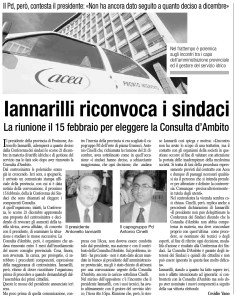 Il presidente della provincia di Frosinone, Antonello Iannarilli, adempierà a quanto deciso dalla Conferenza dei sindaci lo scorso 21 dicembre in materia di tariffe idriche e di gestione del servizio ma lo farà solo dopo aver rinnovato la Consulta d’Ambito. Dal centrosinistra le polemiche erano già in crescendo.