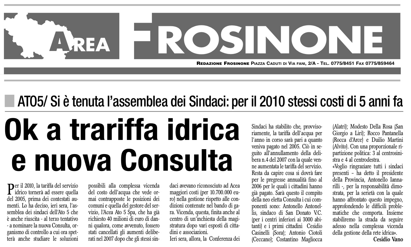 Per il 2010, la tariffa del servizio idrico tornerà ad essere quella del 2005, prima dei contestati aumenti. Lo ha deciso, ieri sera, l’assemblea dei sindaci dell’Ato 5 che è anche riuscita – al terzo tentativo – a nominare la nuova Consulta, organismo di controllo a cui ora spetterà anche studiare le soluzioni possibili alla complessa vicenda del costo dell’acqua che vede ormai contrapposte le posizioni dei comuni e quella del gestore del servizio, l’Acea Ato 5 Spa, che ha già richiesto 40 milioni di euro di danni qualora, come avvenuto, fossero stati cancellati gli aumenti deliberati nel 2007 dopo che gli stessi sindaci avevano riconosciuto ad Acea maggiori costi (per 10.700.000 euro) nella gestione rispetto alle condizioni contenute nel bando di gara. Vicenda, questa, finita anche al centro di un’inchiesta della magistratura dopo vari esposti di cittadini e associazioni. Ieri sera, allora, la Conferenza dei Sindaci ha stabilito che, provvisoriamente, la tariffa dell’acqua per l’anno in corso sarà pari a quanto veniva pagato nel 2005. Ciò in seguito all’annullamento della delibera n.4 del 2007 con la quale venne aumentata le tariffa del servizio. Resta da capire cosa si dovrà fare per le pregresse annualità fino al 2006 per le quali i cittadini hanno già pagato. Sarà questo il compito della neo eletta Consulta i cui componenti sono: Antonello Antonellis, sindaco di San Donato V.C. (per i centri inferiori ai 3000 abitanti) e i primi cittadini Cesidio Casinelli (Sora); Antonio Ciotoli (Ceccano); Costantino Magliocca (Alatri); Modesto Della Rosa (San Giorgio a Liri); Rocco Pantanella (Rocca d’Arce) e Duilio Martini (Alvito). Con una proporzionale ripartizione politica: 3 al centrosinistra e 4 al centrodestra. «Voglio ringraziare tutti i sindaci presenti – ha detto il presidente della Provincia, Antonello Iannarilli -, per la responsabilità dimostrata, per la serietà con la quale hanno affrontato questo impegno, approfondendo le difficili problematiche che comporta. Insieme stabiliremo la strada da seguire adesso nella complessa vicenda della gestione della rete idrica».