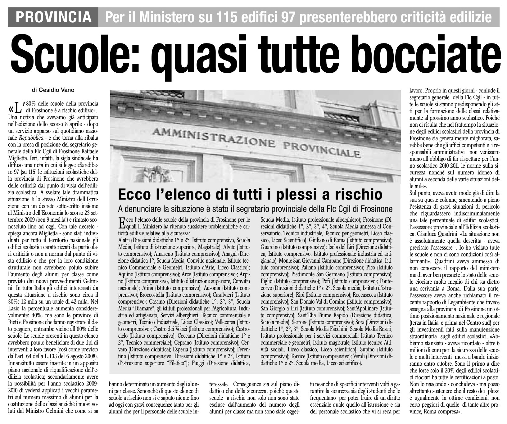 «L’80% delle scuole della provincia di Frosinone è a rischio edilizio». Una notizia che avevamo già anticipato nell’edizione dello scorso 8 aprile – dopo un servizio apparso sul quotidiano nazionale Repubblica – e che torna alla ribalta con la presa di posizione del segretario generale della Flc Cgil di Frosinone Raffaele Miglietta. Ieri, infatti, la sigla sindacale ha diffuso una nota in cui si legge: «Sarebbero 97 (su 115) le istituzioni scolastiche della provincia di Frosinone che avrebbero delle criticità dal punto di vista dell’edilizia scolastica. A svelare tale drammatica situazione è lo stesso Ministro dell’Istruzione con un decreto sottoscritto insieme al Ministro dell’Economia lo scorso 23 settembre 2009 (ben 9 mesi fa!) e rimasto sconosciuto fino ad oggi. Con tale decreto – spiega ancora Miglietta – sono stati individuati per tutto il territorio nazionale gli edifici scolastici caratterizzati da particolari criticità o non a norma dal punto di vista edilizio e che per la loro condizione strutturale non avrebbero potuto subire l’aumento degli alunni per classe come previsto dai nuovi provvedimenti Gelmini. In tutta Italia gli edifici interessati da questa situazione a rischio sono circa il 30%: 12 mila su un totale di 42 mila. Nel Lazio la percentuale aumenta considerevolmente: 40%, ma sono le province di Rieti e Frosinone che fanno registrare il dato peggiore, entrambe vicine all’80% delle scuole. Le scuole presenti in questo elenco avrebbero potuto beneficiare di due tipi di interventi a loro favore (così come previsto dall’art. 64 della L.133 del 6 agosto 2008). Innanzitutto essere inserite in un apposito piano nazionale di riqualificazione dell’edilizia scolastica; secondariamente avere la possibilità per l’anno scolastico 2009-2010 di vedersi applicati i vecchi parametri sul numero massimo di alunni per la costituzione delle classi anziché i nuovi voluti dal Ministro Gelmini che come si sa hanno determinato un aumento degli alunni per classe. Senonché di questo elenco di scuole a rischio non si è saputo niente fino ad oggi con gravi conseguenze tanto per gli alunni che per il personale delle scuole interessate. Conseguenze sia sul piano didattico che della sicurezza, poiché queste scuole a rischio non solo non sono state escluse dall’aumento del numero degli alunni per classe ma non sono state oggetto neanche di specifici interventi volti a garantire la sicurezza sia degli studenti che le frequentano per poter fruire di un diritto essenziale quale quello all’istruzione e sia del personale scolastico che vi si reca per lavoro. Proprio in questi giorni – conlude il segretario generale della Flc Cgil – in tutte le scuole si stanno predisponendo gli atti per la formazione delle classi relativamente al prossimo anno scolastico. Poiché non ci risulta che nel frattempo la situazione degli edifici scolastici della provincia di Frosinone sia generalmente migliorata, sarebbe bene che gli uffici competenti e i responsabili amministrativi non venissero meno all’obbligo di far rispettare per l’anno scolastico 2010-2011 le norme sulla sicurezza nonché sul numero idoneo di alunni a seconda delle varie situazioni delle aule». Sul punto, aveva avuto modo già di dire la sua su queste colonne, smentendo a pieno l’esistenza di gravi situazioni di pericolo che riguardassero indiscriminatamente una tale percentuale di edifici scolastici, l’assessore provinciale all’Edilizia scolastica, Gianluca Quadrini. «La situazione non è assolutamente quella descritta – aveva precisato l’assessore -. Io ho visitato tutte le scuole e non ci sono condizioni così allarmanti». Quadrini aveva ammesso di non conoscere il rapporto del ministero ma di aver ben presnete lo stato delle scuole ciociare molto meglio di chi sta dietro una scrivania a Roma. Dalla sua parte, l’assessore aveva anche richiamato il recente rapporto di Legambiente che invece assegna alla provincia di Frosinone un ottimo posizionamento nazionale e regionale (terza in Italia e prima nel Centro-sud) per gli investimenti fatti sulla manutenzione straordinaria sugli edifici scolastici. «Abbiamo stanziato – aveva ricordato – oltre 6 milioni di euro per la sicurezza delle scuole e molti interventi messi a bando inizieranno entro ottobre. Sono il primo a dire che forse solo il 20% degli edifici scolastici ciociari ha tutte le certificazioni a posto. Non lo nascondo – concludeva – ma posso altrettanto sostenere che il resto dei plessi è ugualmente in ottime condizioni, non certo peggiori di quelle di tante altre province, Roma compresa».