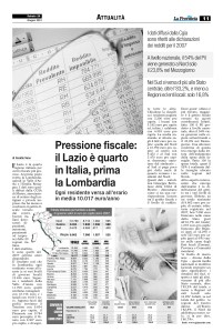 Il Lazio è la quarta regione italiana per carico fiscale più gravoso. Al primo posto svetta la Lombardia, quindi la Valle d’Aosta e l’Emilia Romagna. I dati sono quelli diffusi dalla CGIA di Mestre, associazione di settore degli artigiani e piccole imprese che ha messo a confronto il gettito fiscale versato dai contribuenti italiani (lavoratori dipendenti, autonomi, pensionati od imprese) delle 20 regioni italiane.