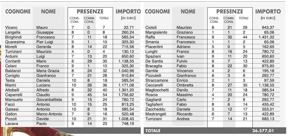 In tutto, da gennaio a giugno scorso, i consiglieri comunali del capoluogo sono “costati” all’ente 26.577 euro e qualche centesimo. Il più presenzialista, che si è perso pochissime riunioni, è stato il consigliere Claudio Caparrelli che ha risposto “Presente!” a 9 sedute di Consiglio comunale ed a ben 45 sedute di Commissione consiliare. In tutto, quindi, 54 presenze che a 32,53 euro fanno 1.756,62 euro. Ovviamente – ripetiamo – parliamo di somme lorde (su cui si applicano le trattenute di legge) e relative ai sei mesi: dal 1° gennaio al 30 giugno. Al secondo posto per presenze/gettoni si piazza il consigliere Francesco Raffa con 44 riunioni (9 di consiglio e 35 di commissioni) per un totale di 1.431,32 euro. Terzo posto per Alfredo Altobelli con 40 presenze (8+32) per 1.301, 20 euro. A seguire tutti gli altri come si può vedere dalla tabella in alto in pagina. Tra i meno presenti e meno “onerosi” per l’ente segnaliamo invece (a parte i nei-proclamati Graziano Mangialento e Francesco Smania appena entrati in assise che accoppiano solo 2 sedute (1+1) per 65,06 euro): Enrico Straccamore, 3 presenze per 97,59 euro; Maurizio Turriziani, 4 presenze per 130,12 euro e Adriano Piacentini, 5 presenze per 162,65 euro.