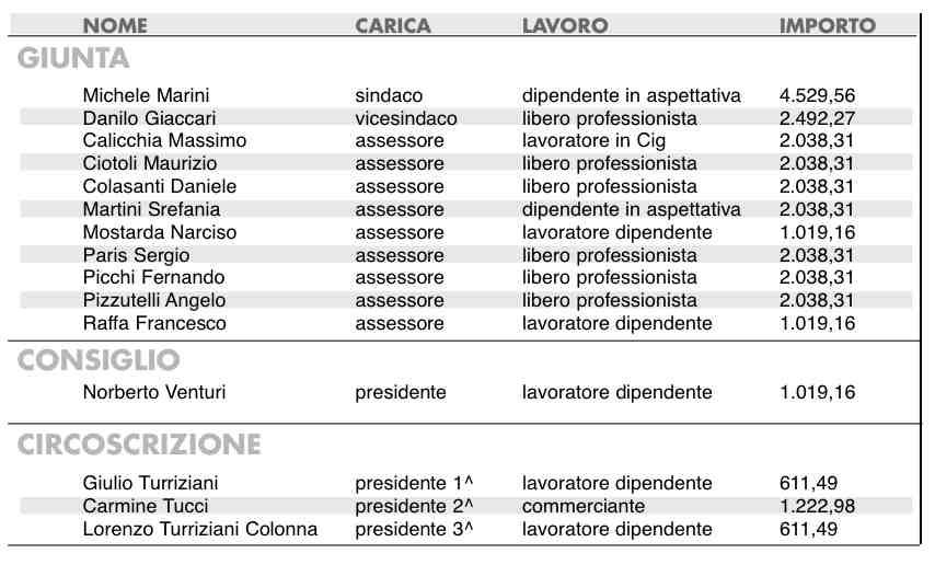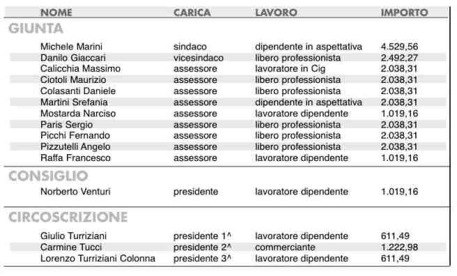 Al sindaco Michele Marini (dipendente in aspettativa) vanno – come detto – 4.529,56 euro. Al suo vice, Danilo Giaccari (libero professionista), 2.492,27 euro; Agli assessori spettano, invece, 2.038,31 euro se liberi professionisti o 1.019,16 euro se lavoratori dipendenti. Nella tabella a lato, nel dettaglio, quanto percepisce mensilmente ogni assessore comunale e quanto i presidenti delle 3 circoscrizioni frusinati. L’indennità per queste ultime cariche è stata completamente cancellata, per il futuro, dalla manovra economica varata dal Governo. Infine, un’indennità pari a quella da assessore spetta anche al presidente del consiglio comunale.