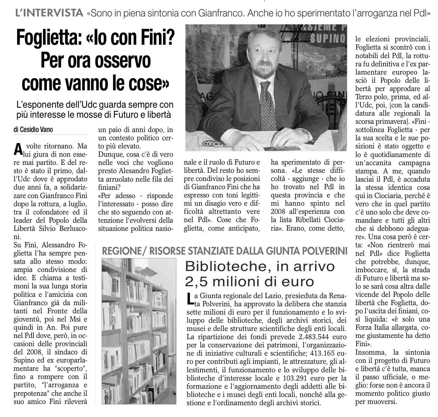 Su Fini, Alessandro Foglietta l’ha sempre pensata allo stesso modo: ampia condivisione di idee. E chiama a testimoni la sua lunga storia politica e l’amicizia con Gianfranco già da militanti nel Fronte della gioventù, poi nel Msi e quindi in An. Poi pure nel Pdl dove, però, in occasioni delle provinciali del 2008, il sindaco di Supino ed ex europarlamentare ha “scoperto”, fino a rompere con il partito, “l’arroganza e prepotenza” che anche il suo amico Fini rileverà un paio di anni dopo, in un contesto politico certo più elevato.