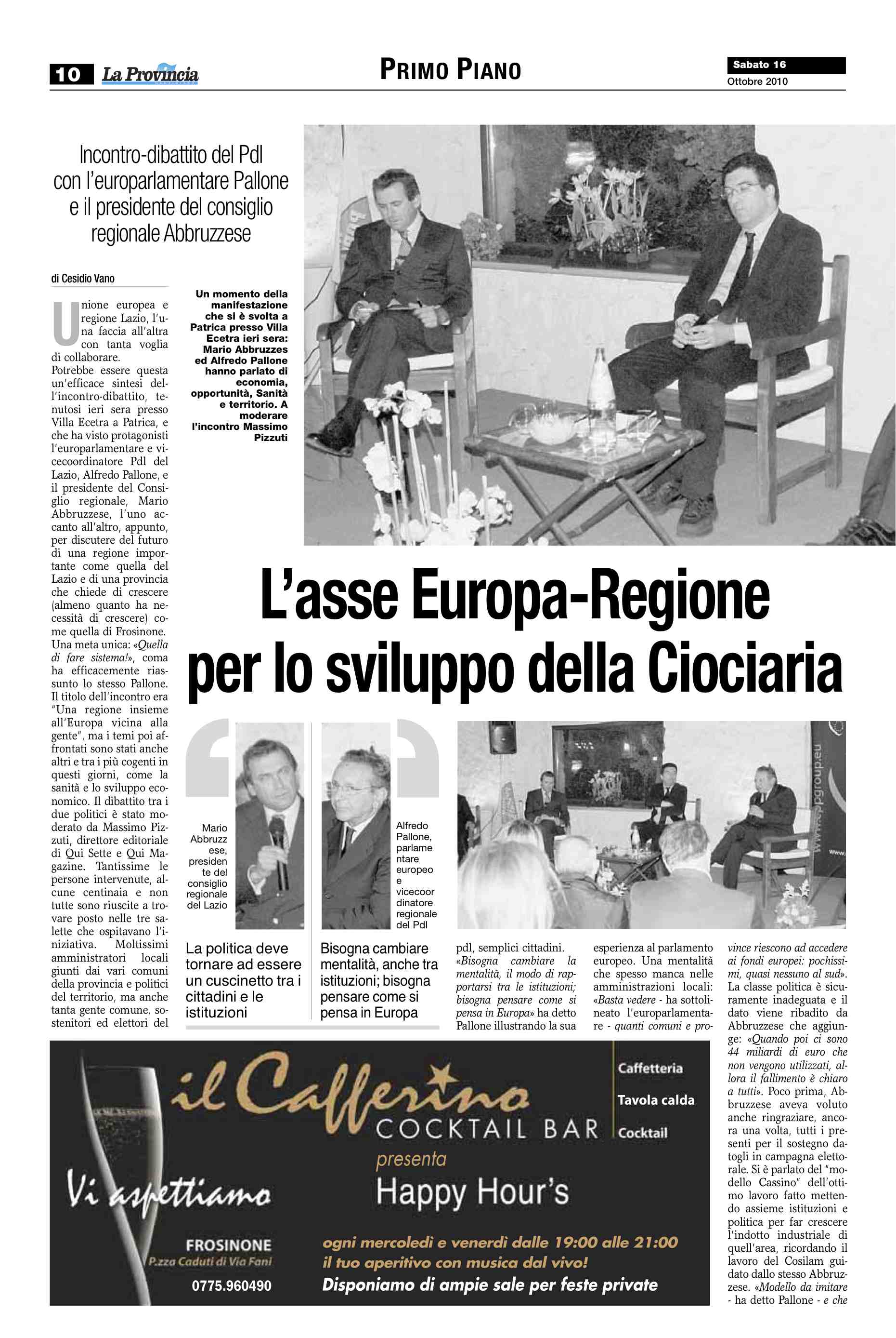 Potrebbe essere questa un’efficace sintesi dell’incontro-dibattito, tenutosi ieri sera presso Villa Ecetra a Patrica, e che ha visto protagonisti l’europarlamentare e vicecoordinatore Pdl del Lazio, Alfredo Pallone, e il presidente del Consiglio regionale, Mario Abbruzzese, l’uno accanto all’altro, appunto, per discutere del futuro di una regione importante come quella del Lazio e di una provincia che chiede di crescere (almeno quanto ha necessità di crescere) come quella di Frosinone.