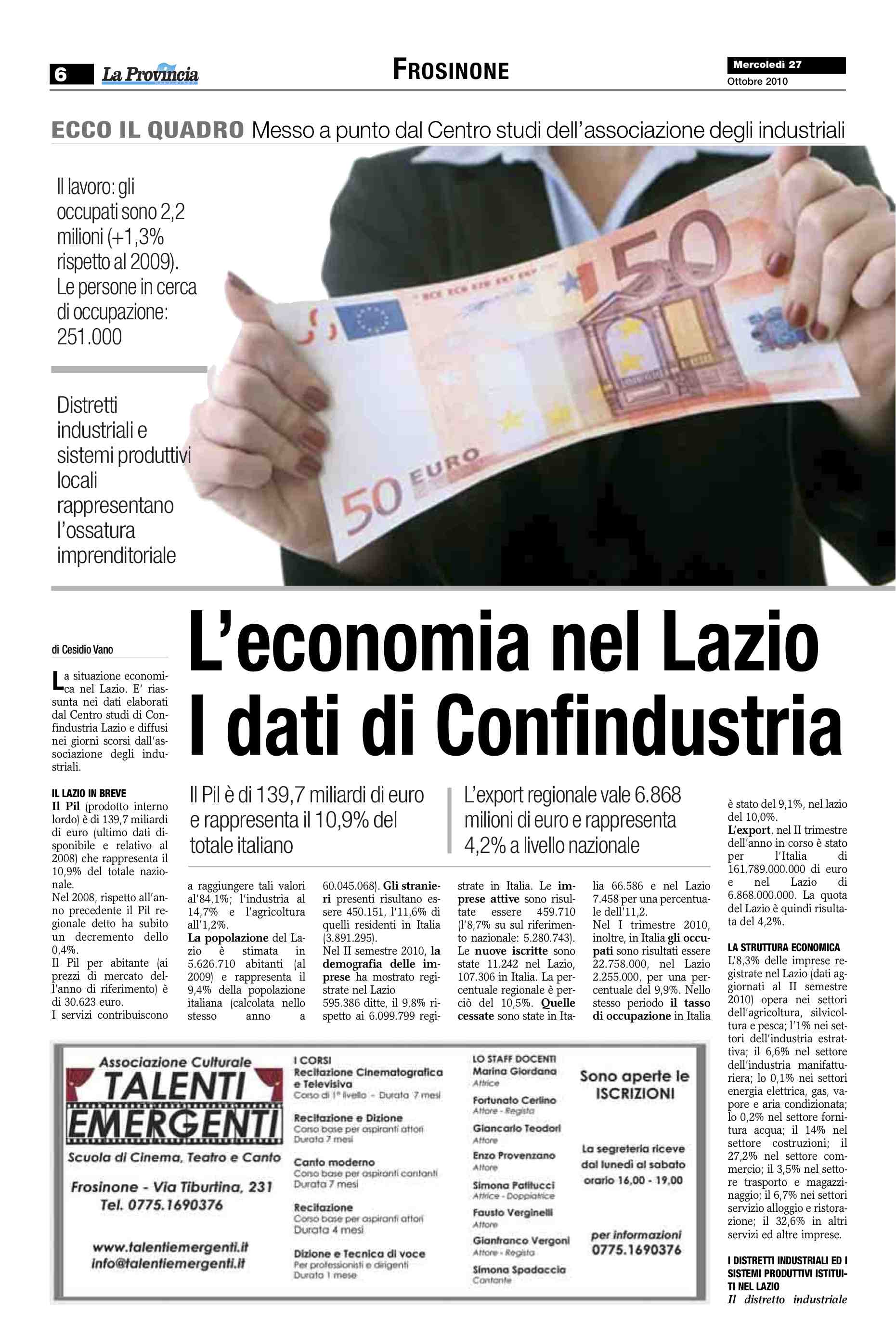 Nel I trimestre 2010, inoltre, in Italia gli occupati sono risultati essere 22.758.000, nel Lazio 2.255.000, per una percentuale del 9,9%. Nello stesso periodo il tasso di occupazione in Italia è stato del 9,1%, nel lazio del 10,0%.