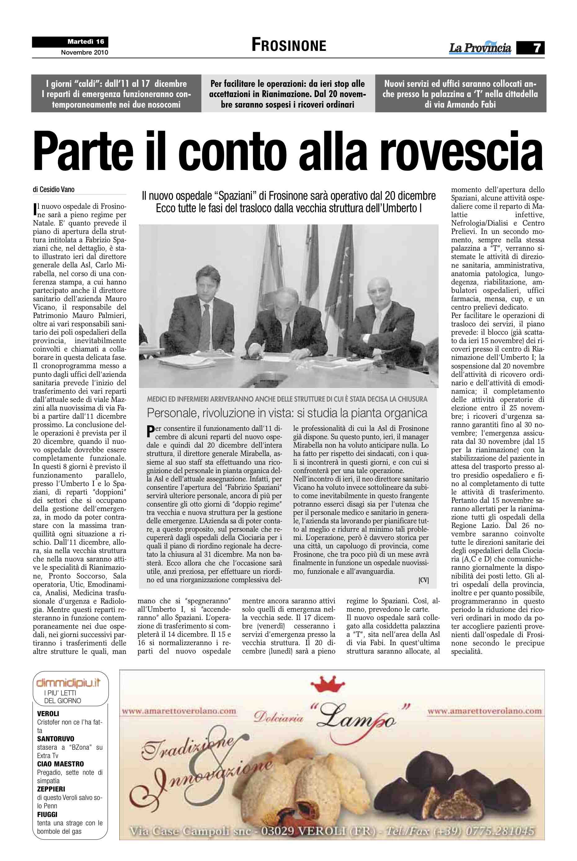 Il nuovo ospedale di Frosinone sarà a pieno regime per Natale. E’ quanto prevede il piano di apertura della struttura intitolata a Fabrizio Spaziani che, nel dettaglio, è stato illustrato ieri dal direttore generale della Asl, Carlo Mirabella, nel corso di una conferenza stampa, a cui hanno partecipato anche il direttore sanitario dell’azienda Mauro Vicano, il responsabile del Patrimonio Mauro Palmieri, oltre ai vari responsabili sanitario dei poli ospedalieri della provincia, inevitabilmente coinvolti e chiamati a collaborare in questa delicata fase.