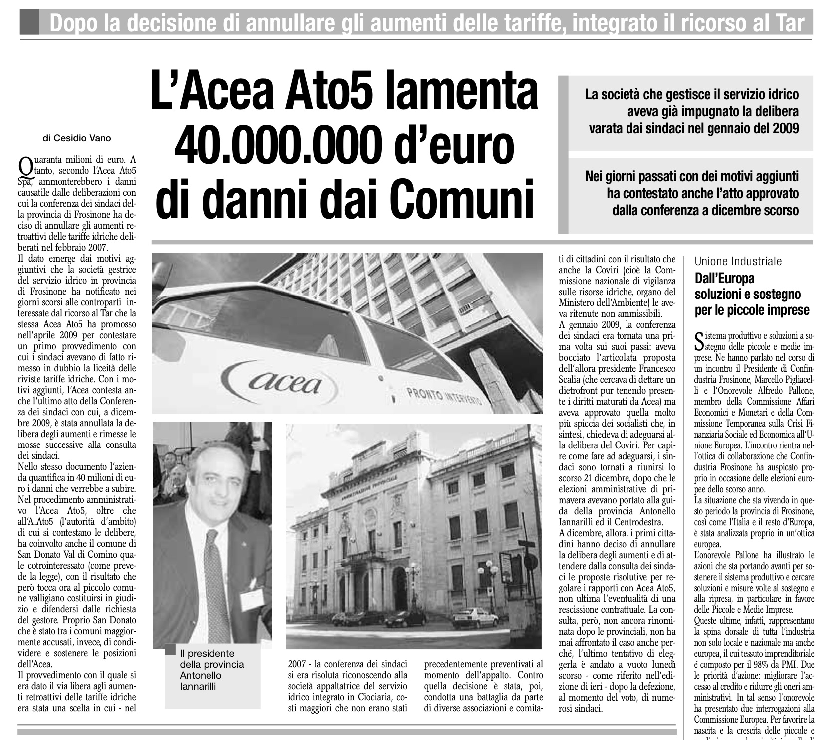 «Il presidente Iannarilli, pur mantenendo forti riserve sull’operato di Acea Ato5, soprattutto sul piano degli investimenti sul territorio e pur insistendo sulla necessità di una forte discontinuità rispetto al passato, ha lasciato trapelare un moderato ottimismo sulla possibilità di un’intesa complessiva con la società, tale da garantire i livelli occupazionali per i prossimi anni pur senza un’eccessiva lievitazione dei costi». E’ quanti riferiscono in un comunicato le sigle sindacali Filcem-Cgil, Femca-Cils e UilCem-Uil che nei giorni scorsi hanno incontrato il capo dell’amministrazione provinciale per far presenti le loro preoccupazioni in merito al livello occupazionale garantito da Acea Ato 5, gestore del servizio idrico provinciale, dopo che la società ha denunciato la possibilità di gavissime difficoltà economiche nel caso dovesse essere confermata la decisione di annullare gli aumento già deliberati delle tariffe idriche. Successivamente all’incontro con Iannarilli, le tre sigle sindacali sono state ricevute anche dai vertici di Acea Ato5: il presidente Raniero Mamalchi ed il nuovo amministratore delegato Stefano Magini. «L’azienda ha denunciato – riferiscono i sindacati -una persistente difficoltà di bilancio per l’anno 2009, derivante soprattutto dall’impossibilità di applicare la tariffa relativa al 2006, che pur non coprendo completamente i costi di gestione come previsto dalle legge Galli, avrebbe limitato la sua pericolosa esposizione finanziaria. D’altra parte ha lamentato che le ripetute riunioni del tavolo di conciliazione tra AAto (l’autorità d’ambito) e Acea Ato5 svoltesi nei mesi di gennaio e febbraio 2010 non hanno prodotto apprezzabili risultati di mediazione. A complicare la situazione – lamentano le tre sigle – si è aggiunta la difficoltà da parte dell’assemblea dei sindaci ad eleggere i componenti della consulta d’ambito, provocando una sostanziale paralisi da parte dell’organo cui la legge ha deputato il controllo delle attività del gestore».
