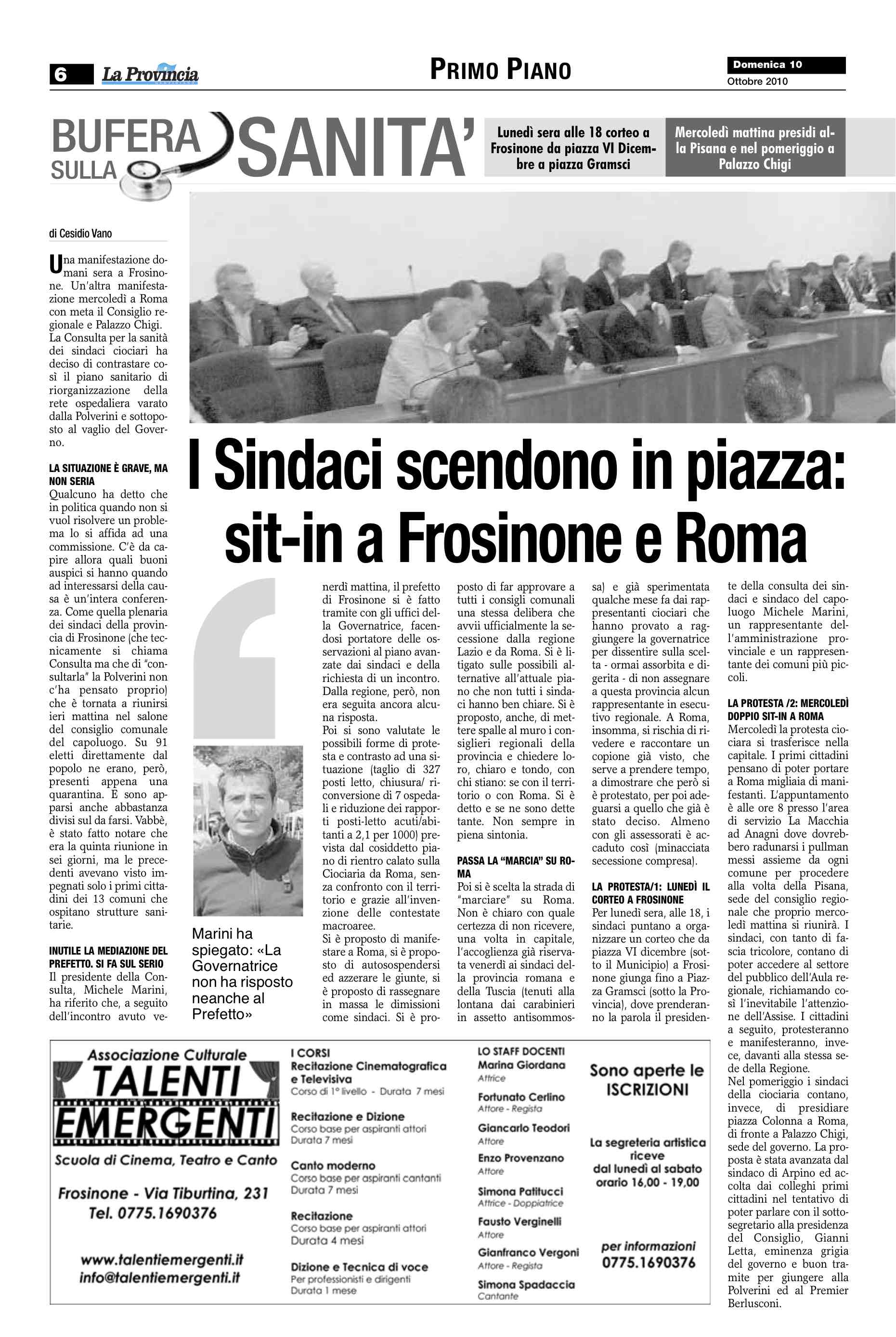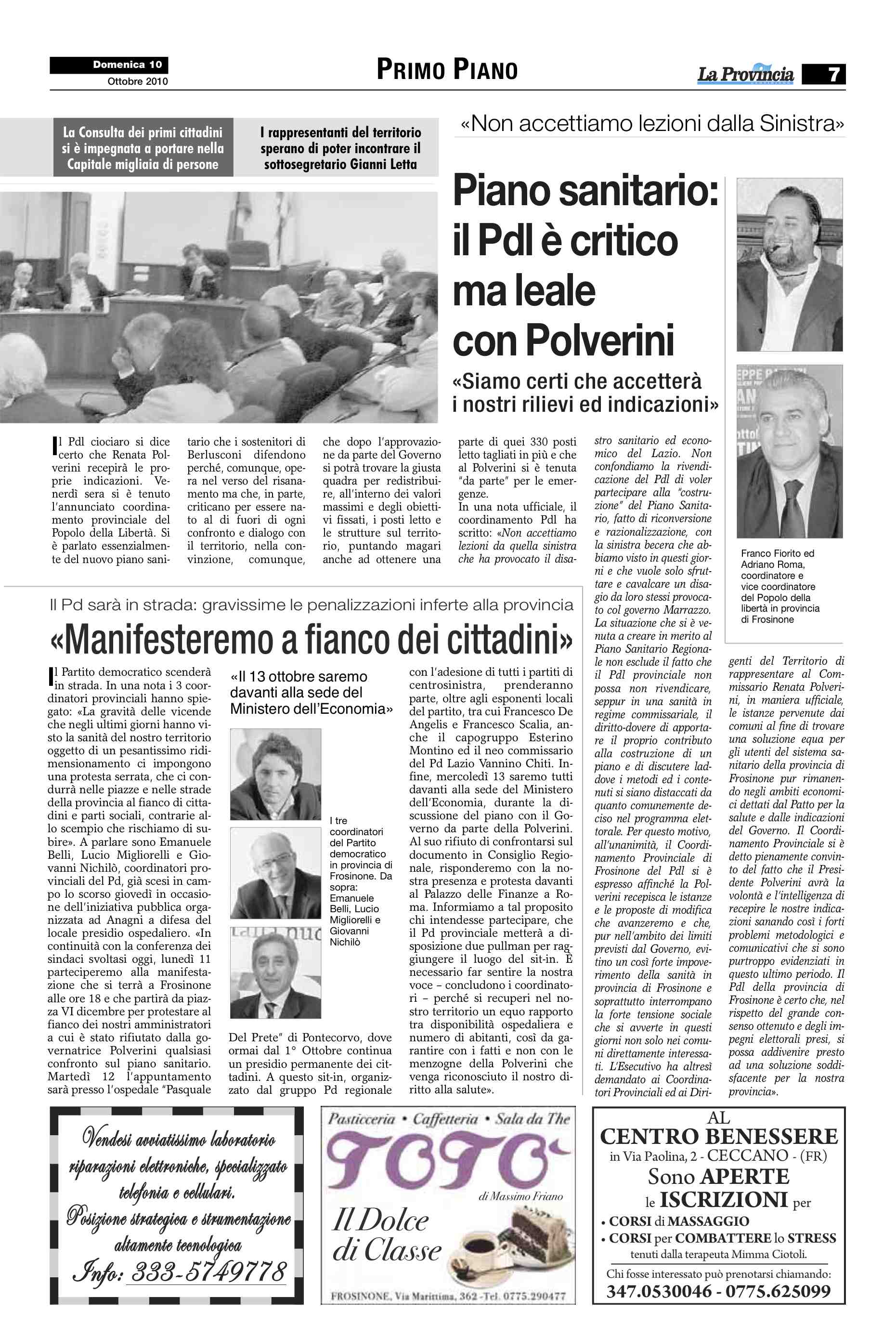 La Polverini ha fatto sapere, ieri sera, che lunedì mattina alle 10 riceverà il presidente della provincia di Frosinone, il sindaco del capoluogo ed una delegazione dei sindaci ciociari per discutere del piano regionale di riordino della rete ospedaliera. Nel frattempo, ieri mattina, giocando d’anticipo, la stessa governatrice del Lazio ha fatto anticipare di un giorno (era in programma per oggi, ndr) l’avvio del tavolo di confronto con il ministero dell’Economia, che deve dare il definitivo benestare alle misure disposte dalla Polverini.